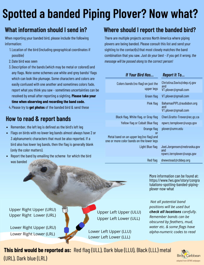 There are several different projects banding Piping Plovers and if you see a banded Piping Plover you can report it to the correct person using the information below. This also provides a guide to reading the bands and the information that will be useful to send when you report a banded bird. The tips in this guide are useful for any banded birds you see not just Piping Plovers! You can find out more about reporting banded Piping Plovers from the U.S. Fish and Wildlife Service here. This 1-page guide is available to download as a pdf here. We also have 2-page version with more information for you to use and share here. And a square infographic that you could share on social media here.
