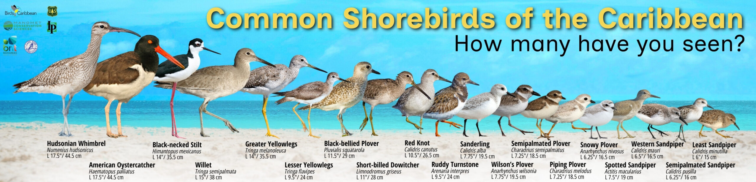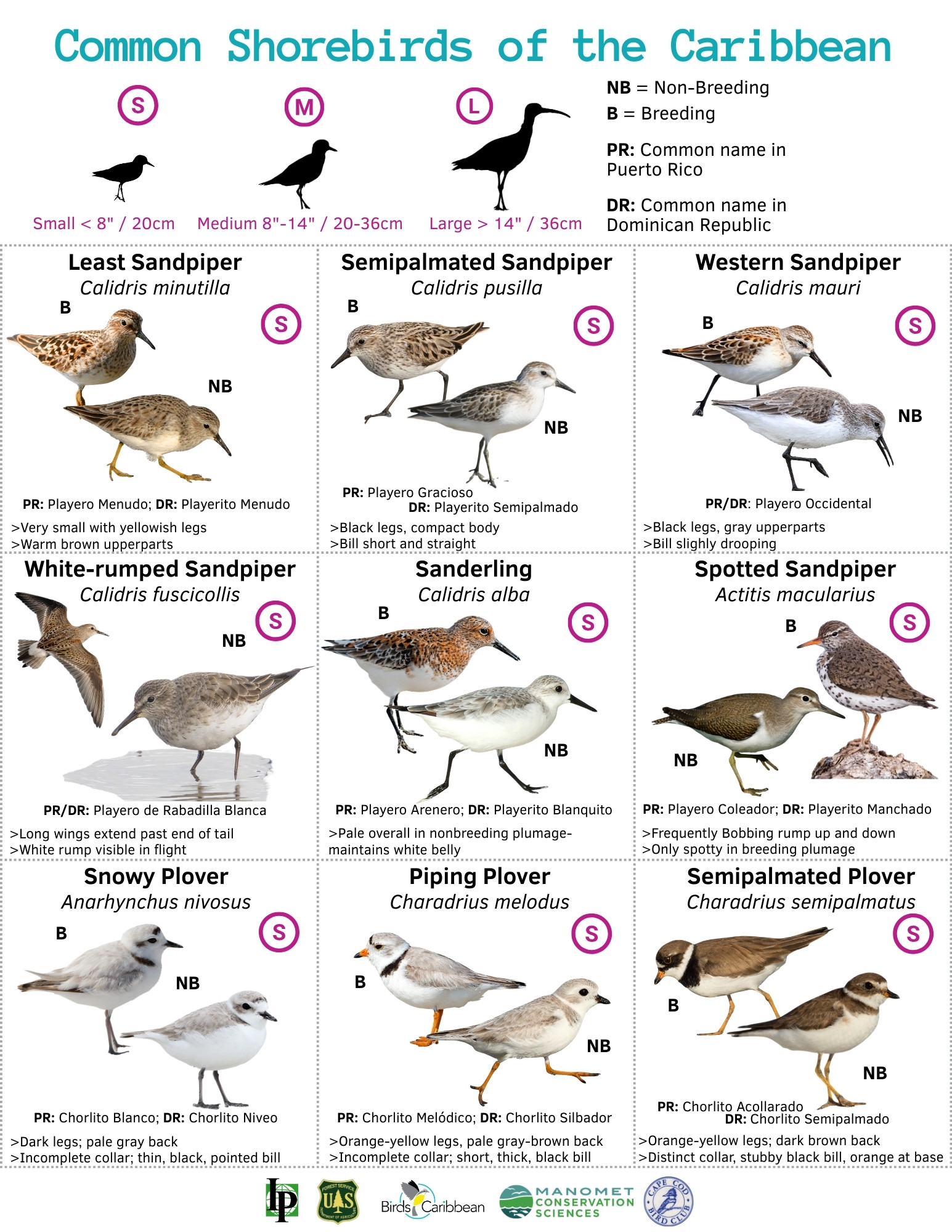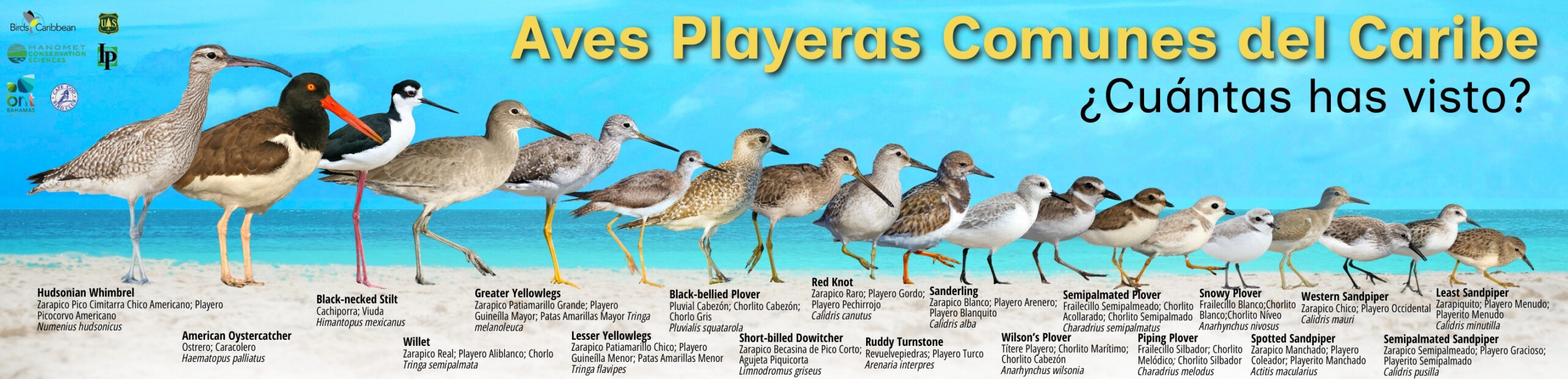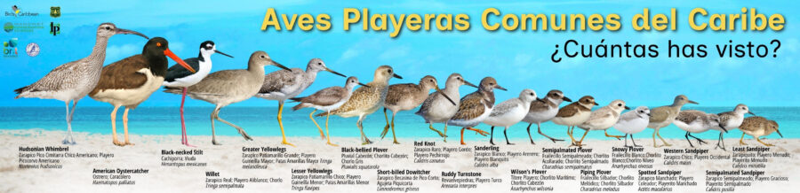 We also have available a two-page Common Shorebirds of the Caribbean ID Guide – you can download it here. This has the bird names in English and in Spanish for Puerto Rico and the Dominican Republic.
