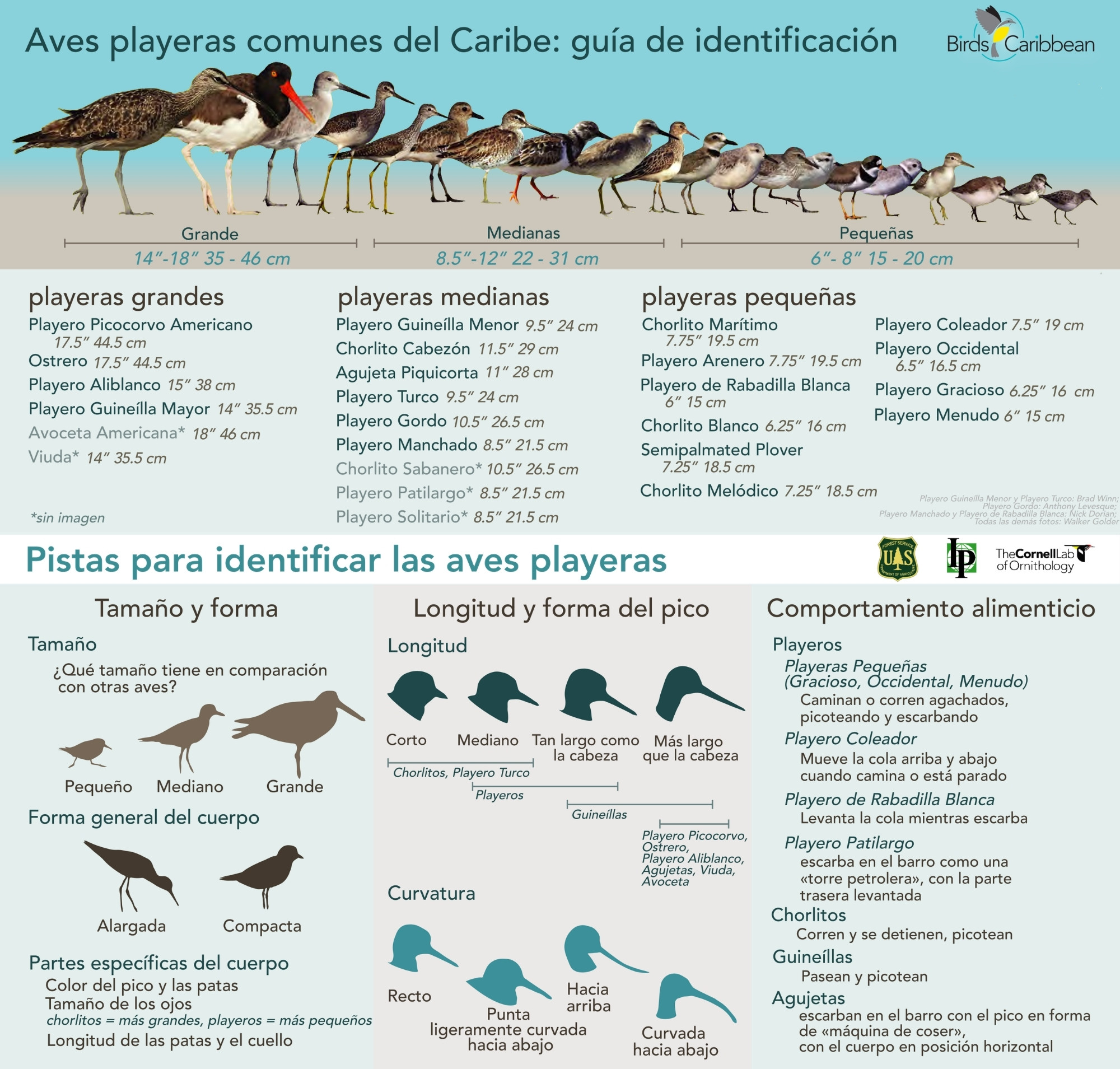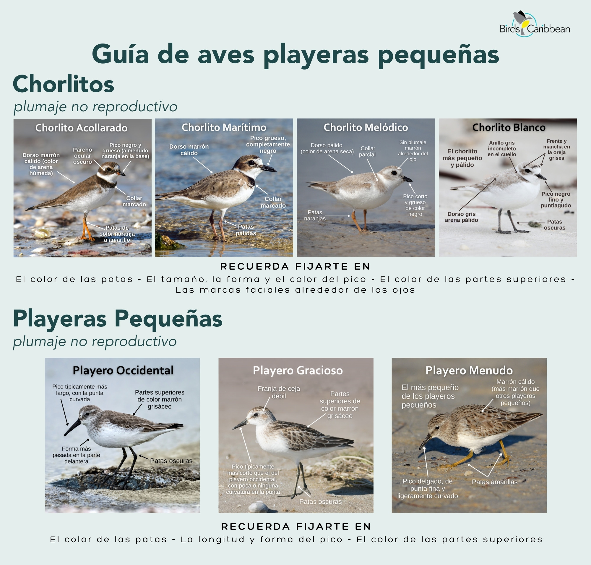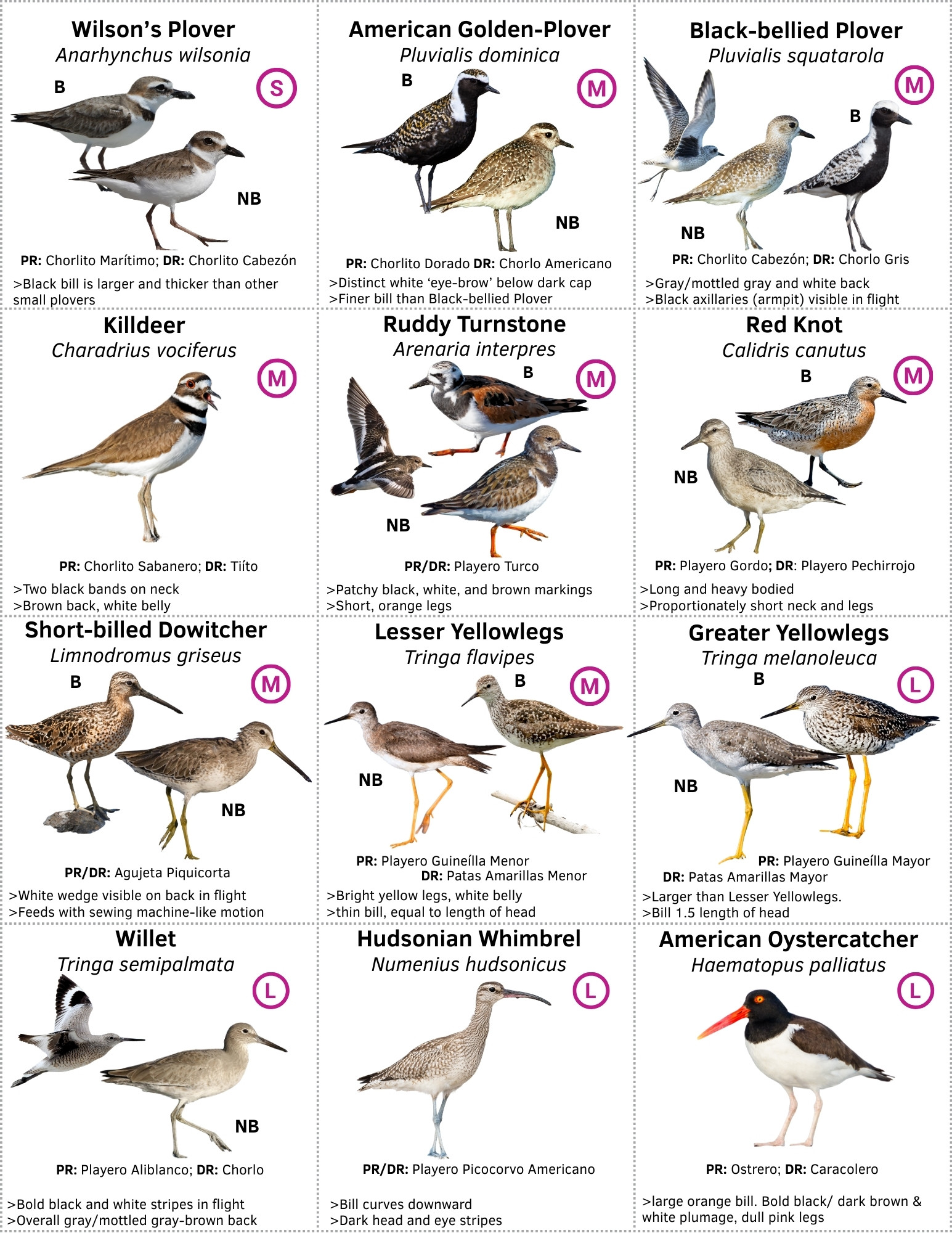 We also have available a two-page Common Shorebirds of the Caribbean ID Guide – you can download it here. This has the bird names in English and in Spanish for Puerto Rico and the Dominican Republic.