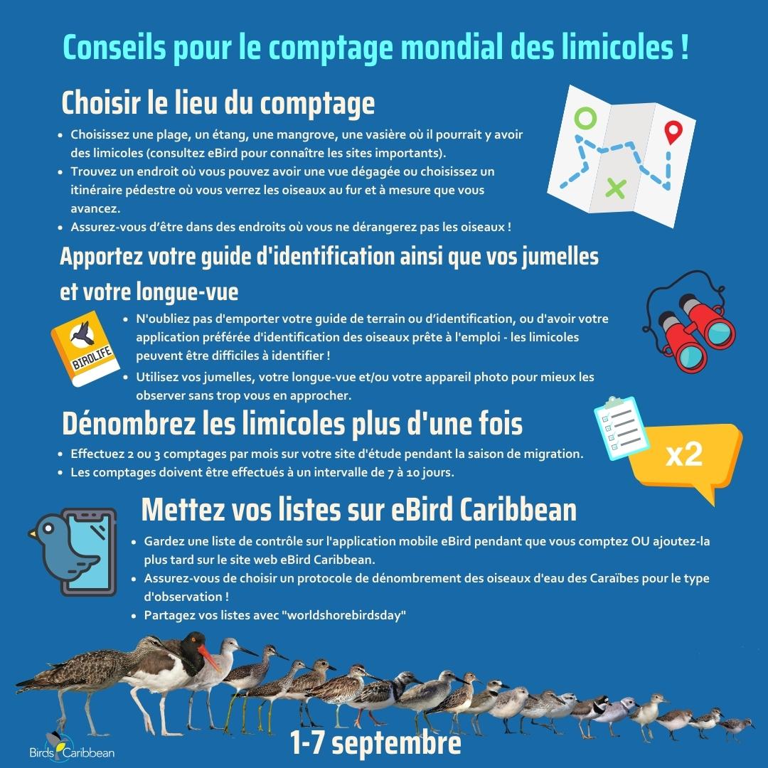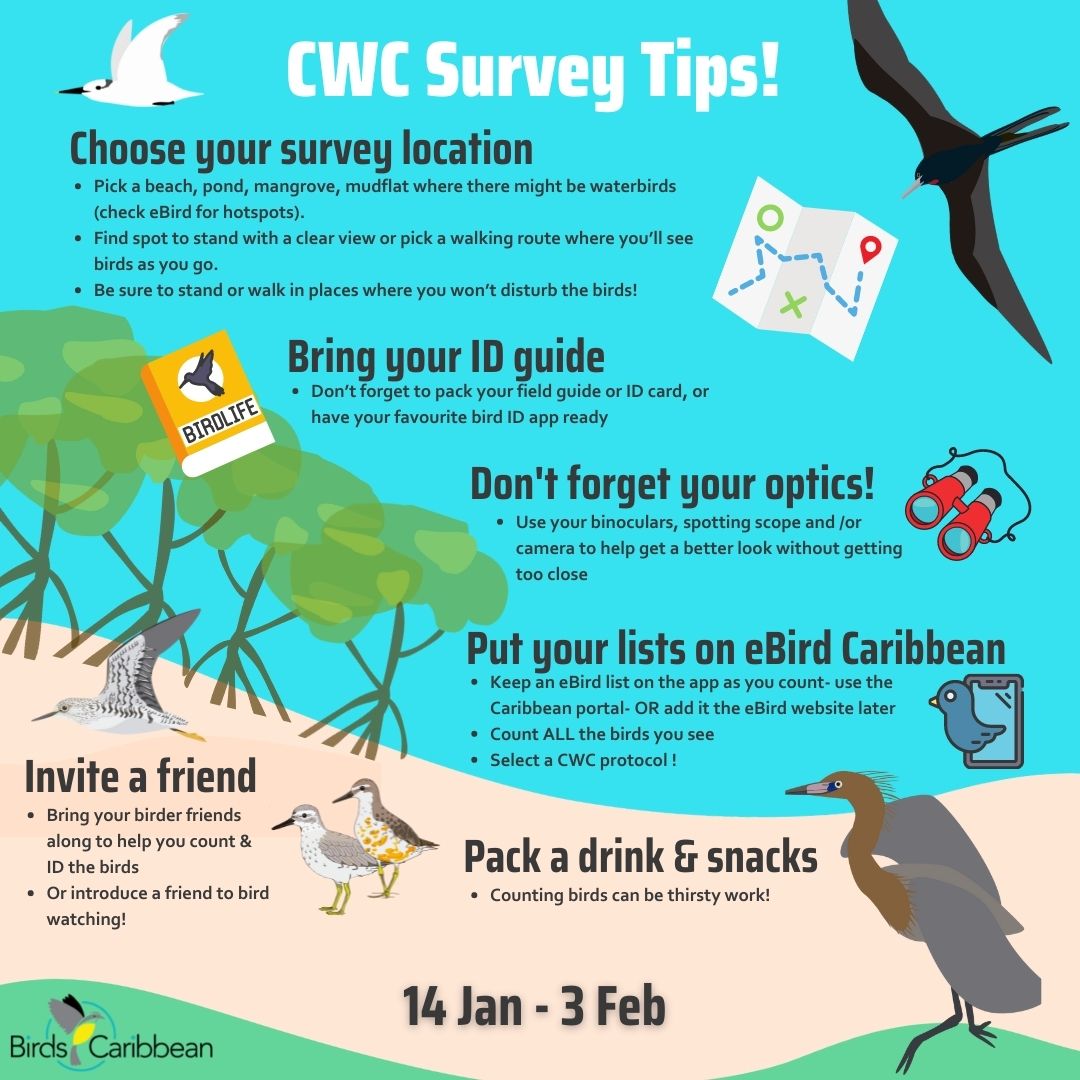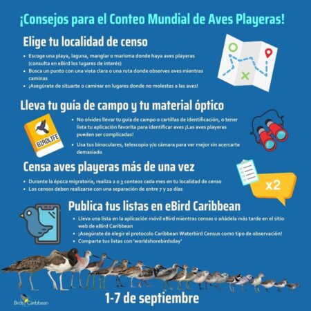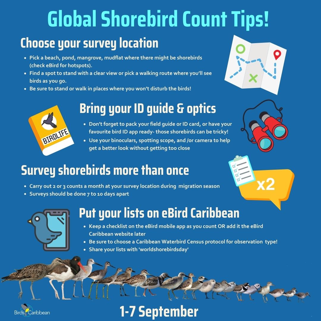 After years of participating in the Global Shorebird Count and co-ordinating the Caribbean Waterbird Census we have created a list of some best practice tips to help make your count go as smoothly as possible. You may download and share this infographic with your fellow birders. (Click each image open (right click and “Save image as…” to use images).
