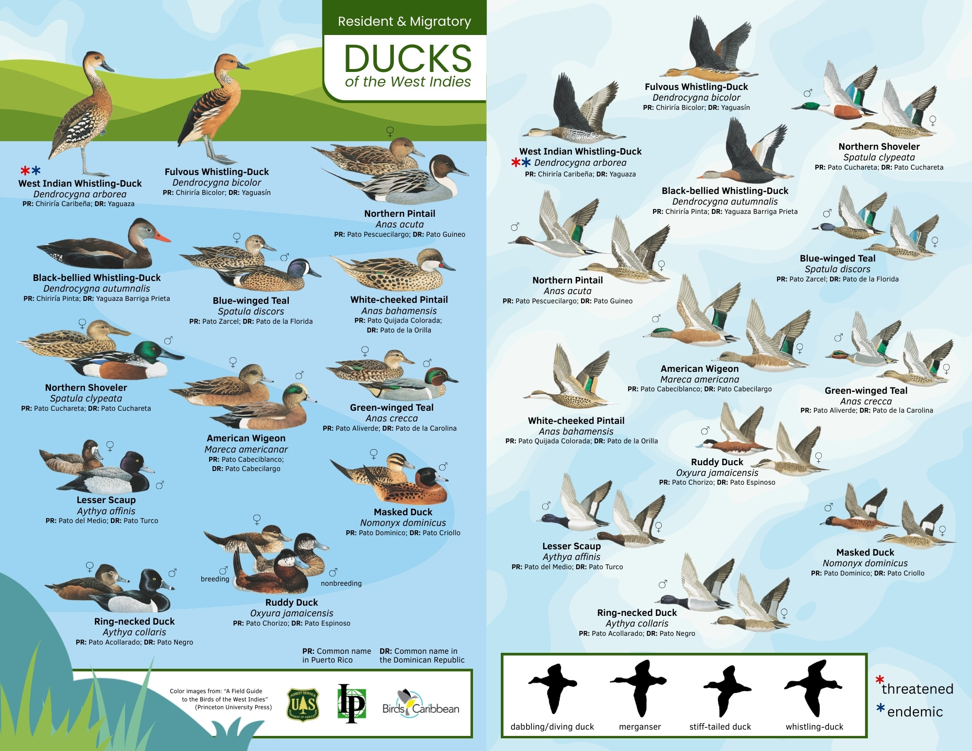We have a two-page Ducks of the West Indies ID Guide. This has the bird names in English and in Spanish for Puerto Rico and the Dominican Republic. You can download it as a small card (half letter size) or letter sized.