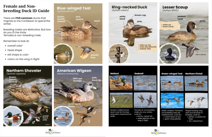 You can use this two-sided guide to help ID some of the more common migratory ducks that use the Caribbean, when they are in female or non-breeding plumage, download the guide here.