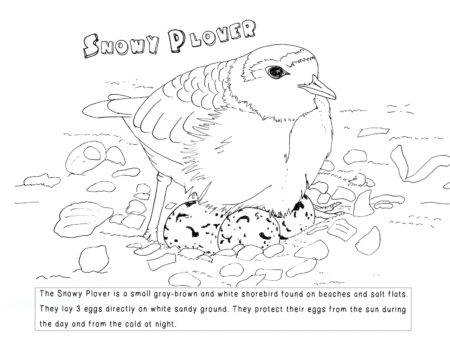 This is a perfect activity to engage children while teaching them about wildlife and common threats to shorebirds. Print this 9 page coloring book and share the joy and challenges of a young Snowy Plover chick! We anticipate having a French version available soon. Enjoy the coloring book story and illustrations with your kids and download pages or the whole book for your child to color in. Learn more about Snowy Plovers here.