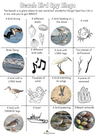 These activities were not designed to teach a child how to name and identify shorebirds, but rather to give them space to explore and feel connected to their natural environment. Parents and guardians, you will not need to worry about your own knowledge of birds or plants. All you need to do is accompany and participate with your child in these activities. Beach Scavenger Hunt. This activity is suitable for children ages 4 to 7 years old. They are asked to find plants and animals at the beach. Beach Bird Bingo. This activity is suitable for children ages 8 to 12 years old. They are asked to find items on the list four in a row, horizontally, vertically or diagonally. They do not need to touch or collect any of the items on the list. Talk about this with your children before beginning any of the activities. They should not touch or collect items on the lists. When observing birds they should speak softly. They do not need to get close to the birds but if they need to, ask them to do so slowly and quietly. You can check off the items (with a pencil or pen), as they are located. When everyone has had a chance to look for the items listed, come back together to chat about what they were able to find or see.