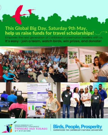 This Global Big Day fundraiser will fund travel scholarships for Caribbean students and wildlife professionals to attend our upcoming International Conference, 23rd – 27th July, 2026, in Port-of-Spain, Trinidad and Tobago. These are dedicated persons who are on the ground, doing the work everyday to secure a future for birds and their habitats. Attending the conference is an invaluable opportunity for them to 1) build upon or gain new skills to address threats to bird conservation on their respective islands, and 2) network with the wider conservation community, share their work, and learn from others. For Caribbean students, this experience will help to kickstart their introduction into the ornithological and conservation community and they will benefit from mentorship opportunities.